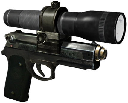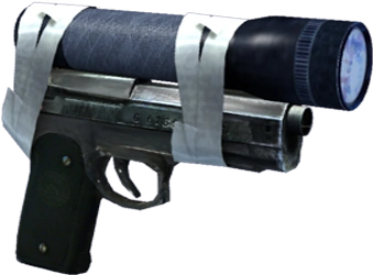 It is a good weapon capable of taking on the most monsters. The charger can be 10 or 15 bullets (Friedman's gun has 15, while the other 10). Despite its name, the gun is semi-automatic; however the time between fire a projectile and the other is very short. Through the use of the adhesive tape it is possible to combine it with different types of flashlights.