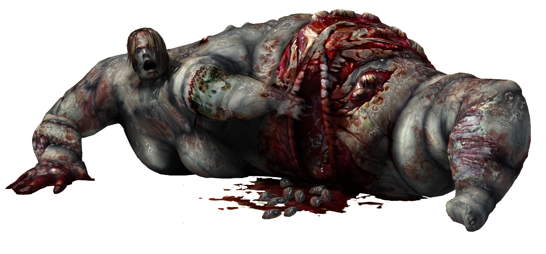 Its misshapen body, too fat and swollen to move, manifests both animal traits and grossly enlarged primary sexual characteristics: its bloated worm body (aside from two obese human breasts) has a vulva-like opening that covers most of its left side and this orifice, kept stretched by the monster's left arm, expels a swarm of maggots the size of a rat; the right arm is large and disproportionate, aptly used to slam enemies and to shield its only weak spot, its disfigured human head.
