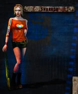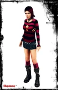 Shannon has medium length blonde hair. She sports a loose neckline orange 3/4 length top with a colorful heart and matching stripes on the sleeves. Words are underneath the heart graphic on her shirt. She wears a very short green camouflage miniskirt, exposing her white underwear in some instances. This is coupled with brown lace up boots and white socks. For accessories, she wears a red bracelet on each hand and red glasses pulled up on her head.